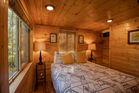 The cabin also comes with a full bathroom featuring a shower/tub combo. Step out onto the front deck and enjoy the private yard overlooking the valley, complete with a propane BBQ grill and fire pit. This cabin can comfortably accommodate 6-8 people.